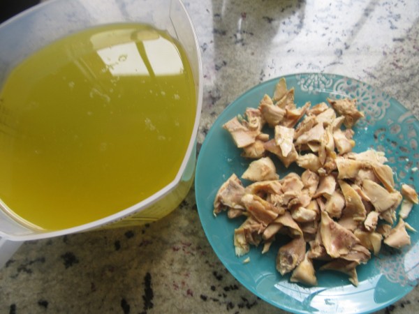 Colar el caldo y trocear el pollo