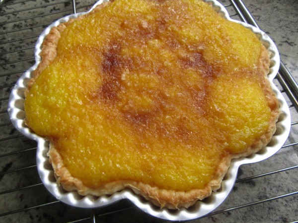 3- Precalentar el horno a 200º. Recortar el hojaldre del tamaño un poquito más grande que las tartaletas, acomodar a los moldes, pellizcando los bordes (No hay que pinchar el hojaldre).(Se puede hacer en una pieza). Rellenar 3/4 partes con la yema fría. Espolvorear azúcar moreno.4- Hornear (200º), unos 20-22 minutos. Dejar enfriar.