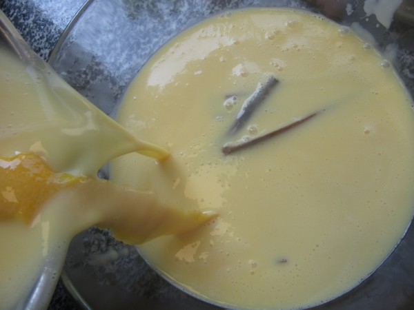 1- Hacer una natilla con la leche semi y evaporada (Podéis utilizar 800 gr, leche entera), yemas y azúcar, triturar todo. Añadir la canela y piel de limón y llevar a fuego bajo removiendo con varillas, sin que llegue a hervir.