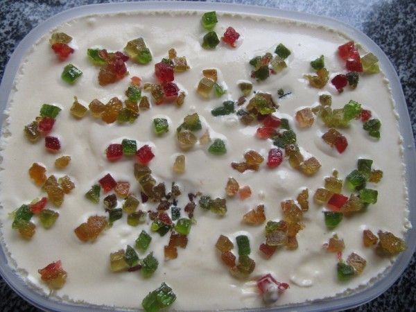 3- Quitar la canela y piel limón. Cremar en la heladera y al final, unir con las frutas confitadas.