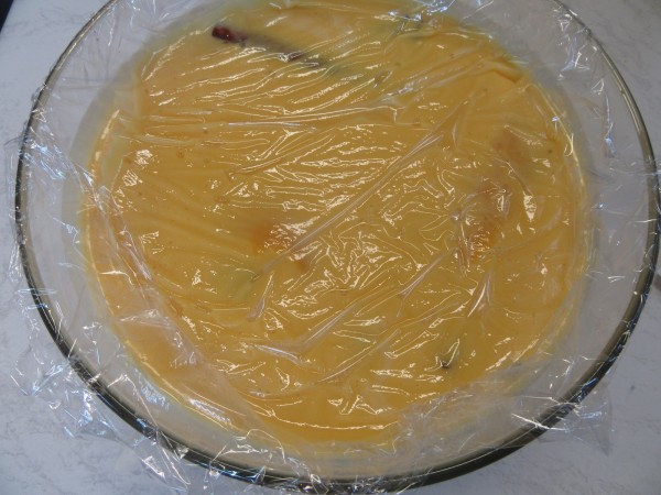 2- Agregar la mantequilla mezclar bien hasta que ésta se funda. Ha de quedar como una crema inglesa. (Natilla fina). Tapar con film pegado a la superficie. Dejar templar y llevar a la nevera hasta que esté la natilla bien fría.