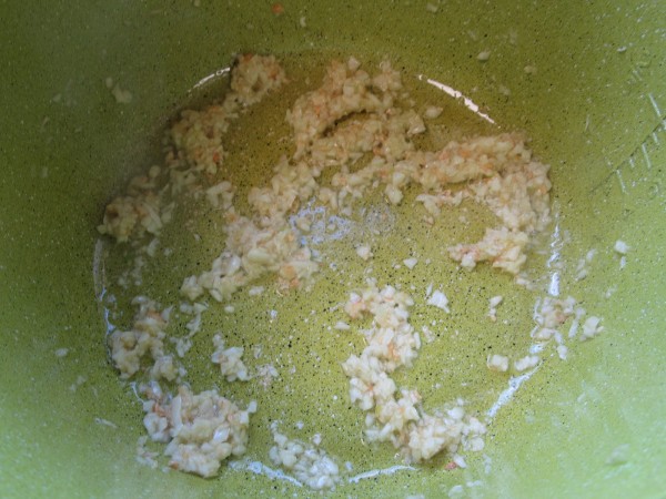 2- Picar los ajos muy menudos y sofreír, hasta que quieran tomar color con un poco de aceite.