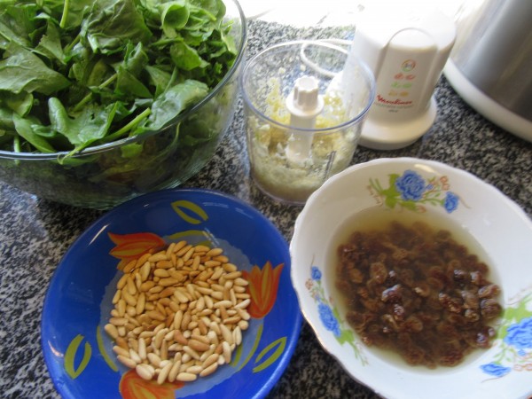 3- Agregar las espinacas, pasas escurridas, piñones, sal y pimienta, remover bien, tapar y cocer 3-5 minutos en su propio jugo a fuego medio.