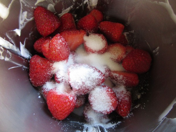 3- Triturar las fresas con el azúcar, y llevar a fuego bajo, sin que llegue a hervir. Sólo que se caliente y se funda el azúcar.