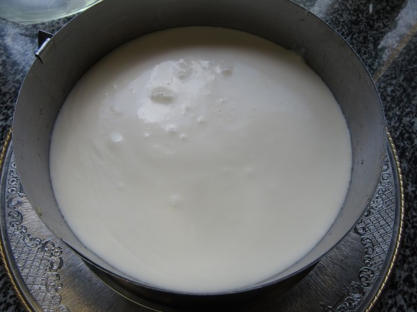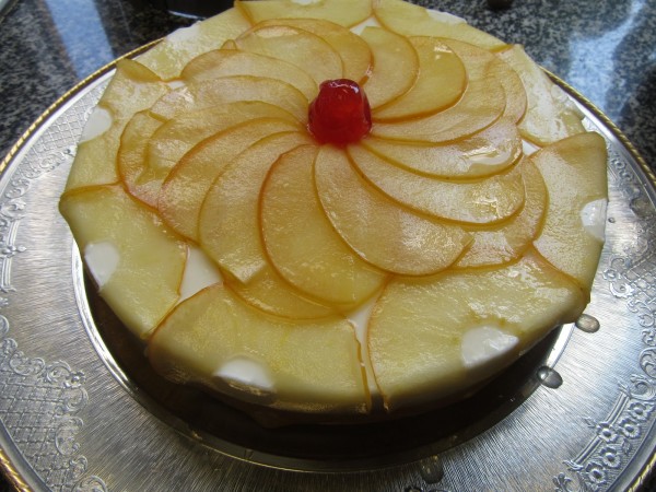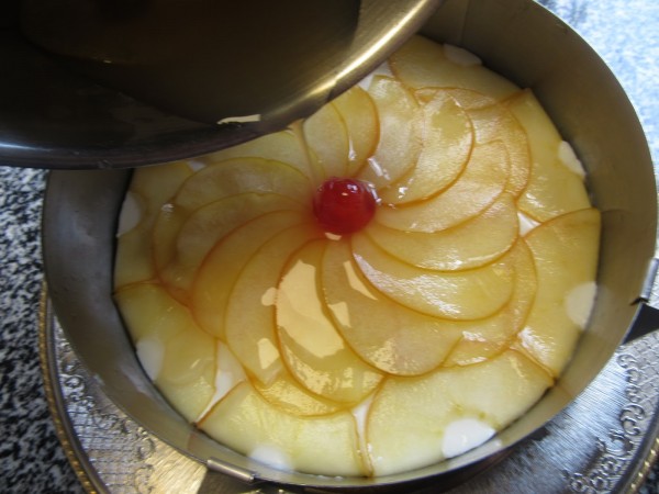 3- Adornar, cubrir con la gelatina y llevar de nuevo a la nevera. (Yo quito el aro, pego las lámina de manzana, vuelvo a ajustar el aro y cubro con la gelatina y a la nevera).