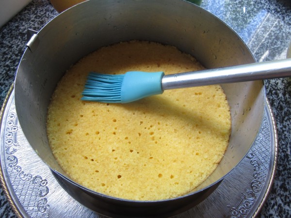 2- Colocar el bizcocho en un aro extensible o molde de unos 20 cm.Una vez frío el bizcocho y almíbar, emborrachar.