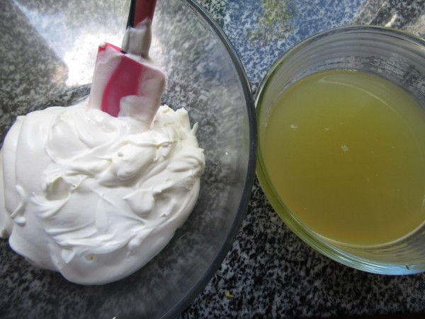 3- Escurrir la gelatina, añadir a la sidra y mezclar. Dejar templar en un bol a temp. ambiente. Unir con la nata con mov. envolventes. Volcar sobre el bizcocho y llevar a la nevera unas horas hasta que cuaje.