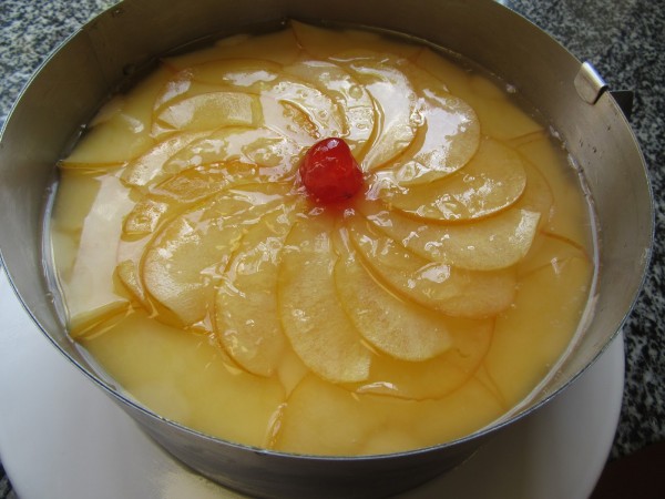 3- Adornar, cubrir con la gelatina y llevar de nuevo a la nevera. (Yo quito el aro, pego las lámina de manzana, vuelvo a ajustar el aro y cubro con la gelatina y a la nevera).