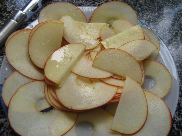 1- Cortar las manzanas en láminas muy finas y rociar con zumo de limón.