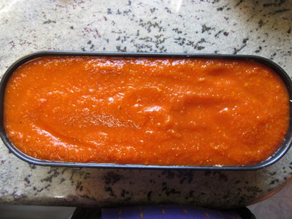 3- Pre-calentar el horno a 180º. Extender la carne en un molde de plum-cake engrasado y cubrir con una capita de tomate. Yo pongo tomate casero, porque no nos gusta el ketchup, pero podéis poner el que os guste.