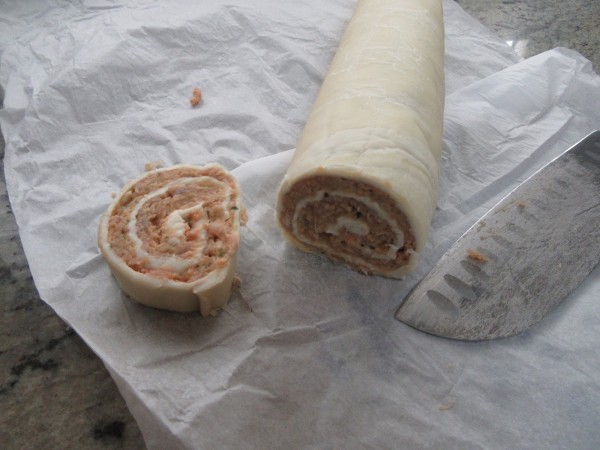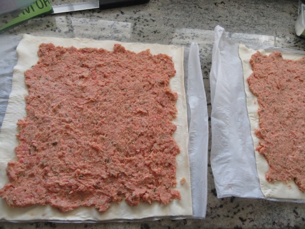 4- Estirar las láminas de hojaldre, extender la mitad de la carne en cada una. Enrollar y llevar el rollo a la nevera, envuelto en el mismo papel de hornear, como 20 minutos. Así lo cortaréis mejor al endurecer el hojaldre. Cortar en discos y aplastar un poco.