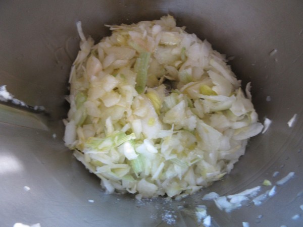 2- Picar el puerro, ajo y cebolla muy menudo y pochar con un poco de aceite hasta que la verdura esté blandita. (