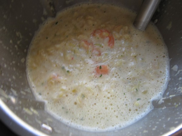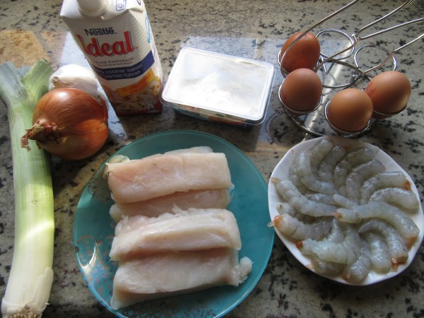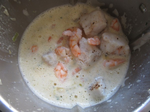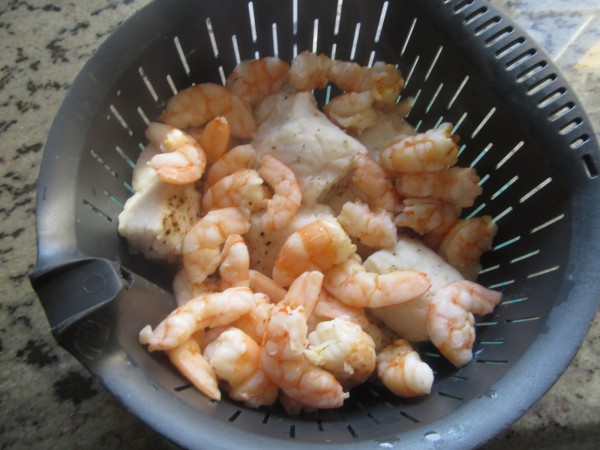 1-Cortar la merluza salpimentada en trozos y poner en una vaporera y encima los langostinos cortados en dos. Hacer al vapor como 10 minutos. Reservar.
