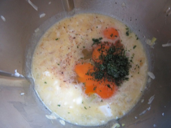 3- Agregar al sofrito la nata, queso, huevos, leche, nuez moscada, perejil, sal y pimienta, y mezclar bien con varillas. Agregar el pescado reservado desmenuzado y mezclar bien.Volcar en molde/s de horno engrasado, espolvorear queso.