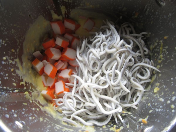 4- Añadir las gulas y palitos en rodajitas y mezclar bien. Dejar reposar unos minutos.