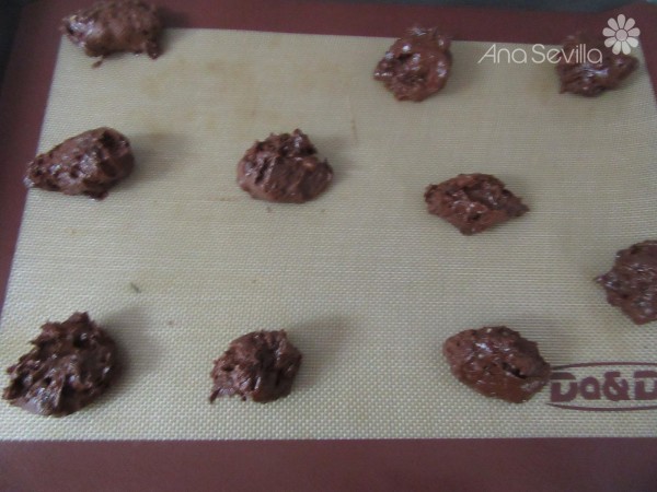 4- Pre-calentar el horno a 185º, sobre la bandeja forrada poner montoncitos con dos cucharitas, separados entre sí.
