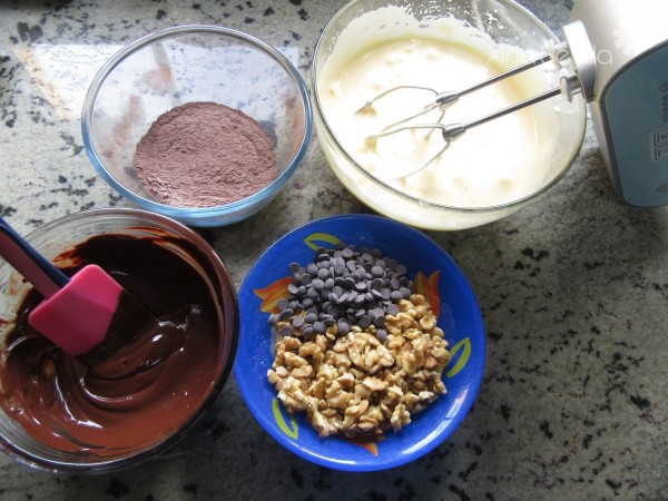 3- Añadir la mezcla de harina poco a poco mezclando con movimientos envolventes. Añadir el chocolate fundido, nueces y gotas de chocolate, y mezclar. Llevar a un bol al congelador 30 minutos.