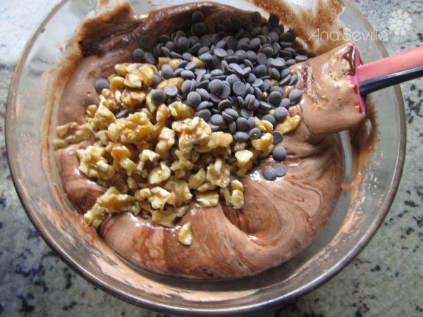 3- Añadir la mezcla de harina poco a poco mezclando con movimientos envolventes. Añadir el chocolate fundido, nueces y gotas de chocolate, y mezclar. Llevar a un bol al congelador 30 minutos.