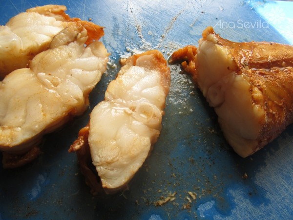 5- Triturar la salsa. Cortar el rape en rodajas, dar un pequeño hervor y servir bien caliente.