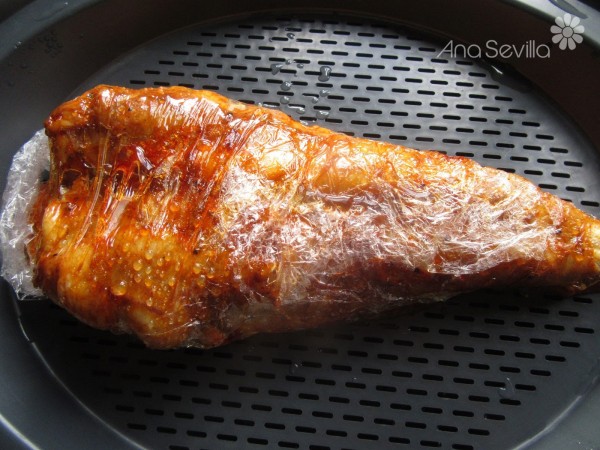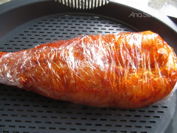 1- Mezclar un chorro de aceite de oliva con una cta. pimentón, sal y pimienta. Embadurnar bien el pescado. Envolver en film y hacerlo al vapor unos 15-18 minutos. Reservar.