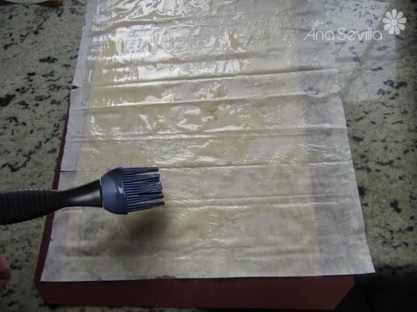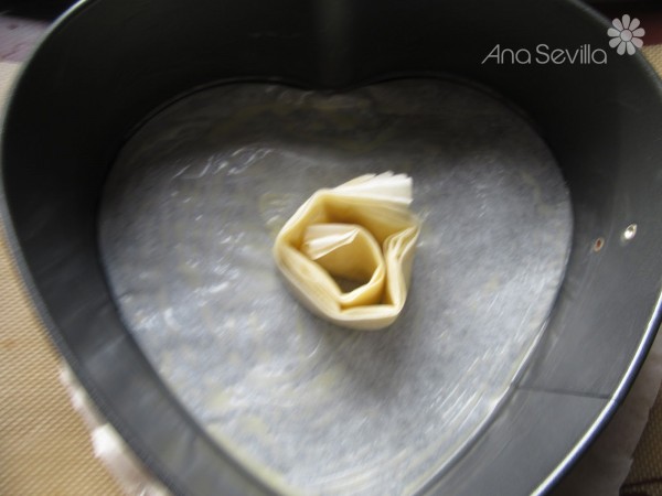 2- Pincelar un molde de unos 20-22 cm. con mantequilla. (Si es desmontable poner antes en el fondo papel de hornear). Pincelar cada lámina de masa filo con mantequilla, solo por un lado e ir doblando como si fuera un acordeón o abanico, para dentro y para fuera. Enrollar en el centro del molde y hacer lo mismo con el resto alrededor.