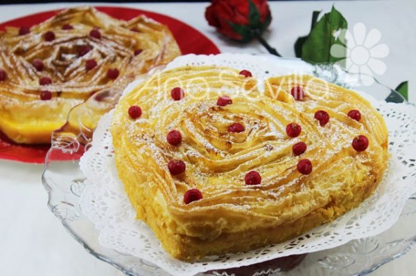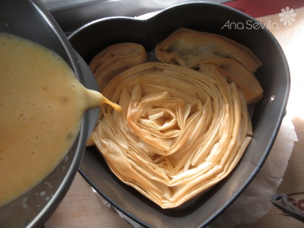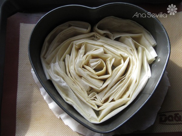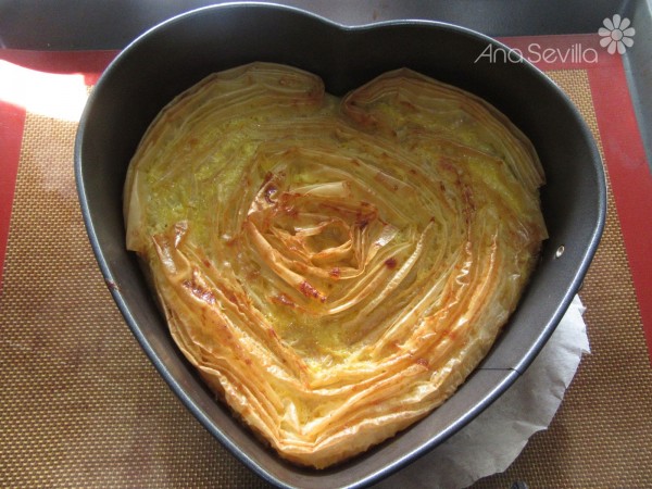 Tarta de griega de masa filo, para San Valentín. Súper crujiente por encima que contrasta con el rico flan del fondo.