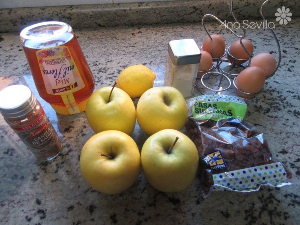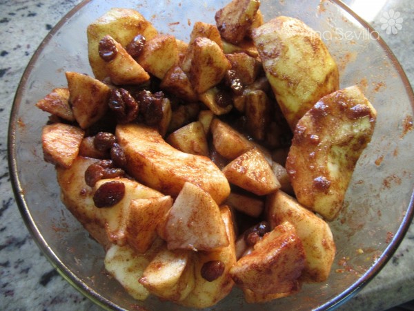 1- Pelar y cortar las manzanas en 16 cuartos, dejar 8 cuartos enteros y 8 en trocitos, todo en un bol. Macerar una 1-2 horas con el azúcar, zumo y ralladura de un limón, miel, canela, jengibre y pasas. Remover de vez en cuando.