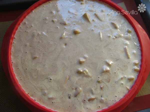 4- En un molde tipo quiche, engrasado de unos 28-30 cm., echar la masa y colocar por encima los 8 cuartos de manzana.