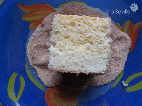 3- Ir volcando la mezcla y pinchando bien el bizcocho. Parecerá que no absorbe más, pero lo "traga" todo poco a poco. Llevar a la nevera unas horas o de un día para otro. Cortar en porciones, rebozar con mezcla de azúcar y canela. Adornar con un poco de nata montada y espolvorear con canela en polvo. Servir bien fríos.