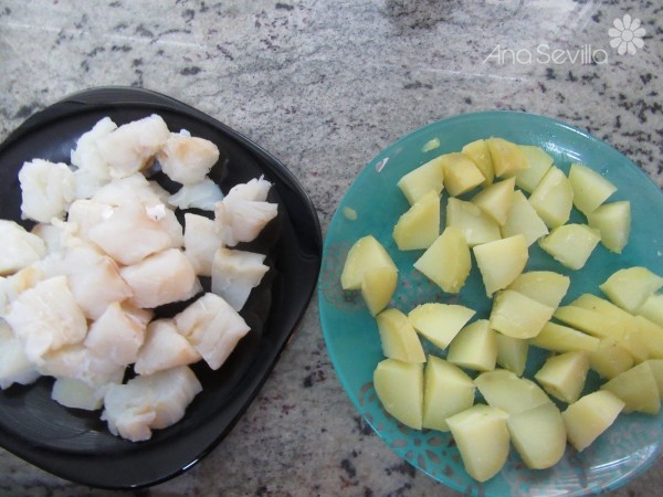 1- Cocer las patatas con piel, agua fría y sal, unos 25 minutos. Dejar templar y pelar. Trocear patatas y bacalao. Reservar.