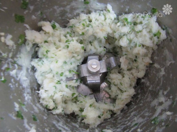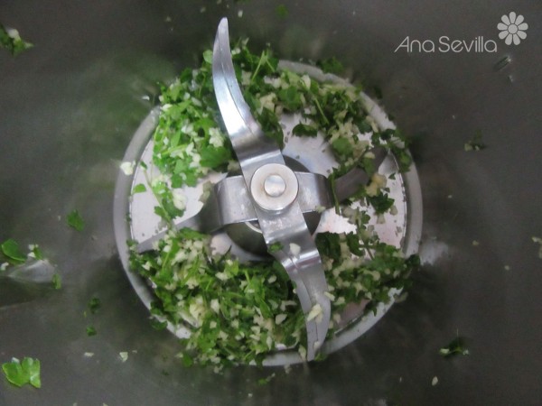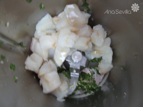 2- Con una picadora, picar los ajos y perejil, 4 seg. vel.5. Añadir el bacalao troceado, y picar.