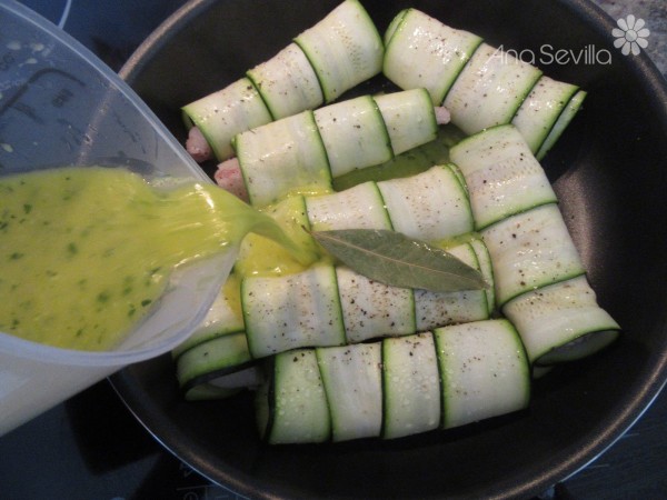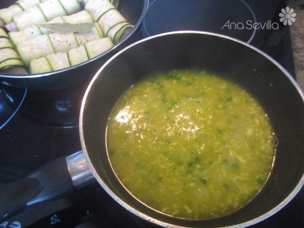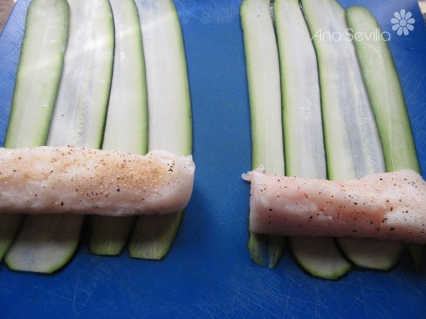 1- Sazonar la merluza con sal, pimienta y ajo en polvo, envolver cada porción con 3 láminas de calabacín superpuestas. Salpimentar y reservar en una sartén amplia o cacerola, con el cierre de las láminas para abajo.