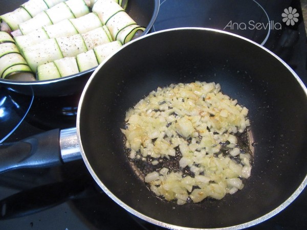 3- Picar la cebolla muy menuda y pochar en otra sartén pequeña con un poco de aceite hasta que esté transparente