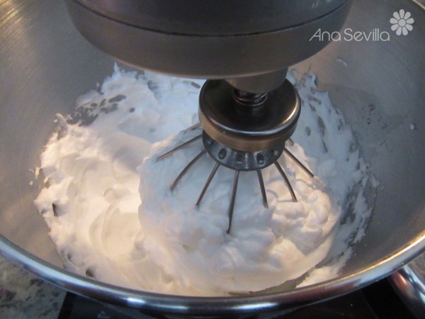 3- Montar las claras con varilla, con unas gotitas de zumo de limón. Cuando ya estén blanquecinas añadir el azúcar normal, (Y colorante si son de color) y seguir batiendo a punto de nieve.