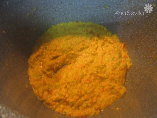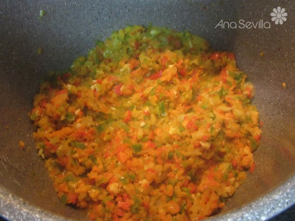 2- Picar la cebolla, ajos, pimiento verde y rojo y zanahoria y sofreír con aceite unos 15 minutos hasta que esté bien pochado. Triturar la mezclar un poco con el turmix con un poco de caldo de carne.