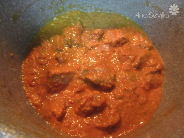1- Adobar la carne en trozos con 1 cta. sal, las especias majadas y el pimentón. Reservar.