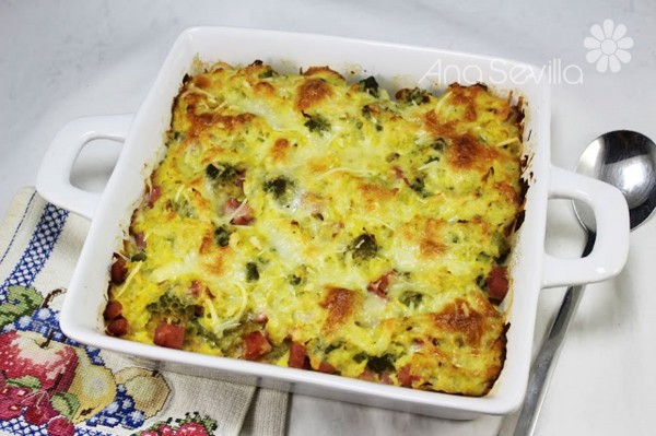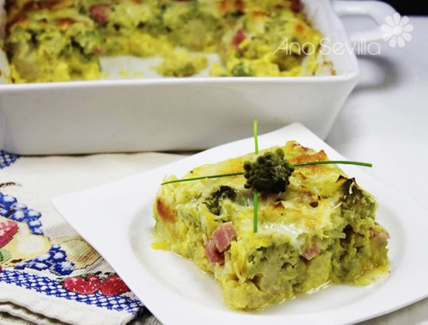 1-Cocer los ramilletes de romanesco como 12-15 minutos con agua y sal. Escurrir en una fuente de horno y repartir los taquitos de jamón por encima.