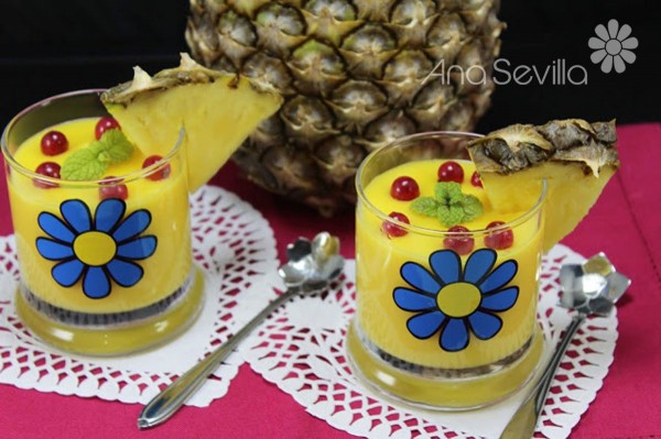 1- Triturar la piña en trozos, azúcar, huevos, maizena y vainilla, que quede un puré muy fino y sin grumos. 10 seg., vel.8.