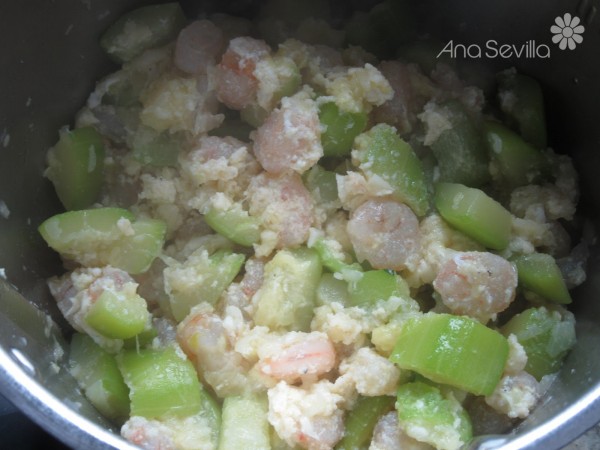 3- A continuación añadir las gambas y a fuego fuerte dos minutos. (Bien escurridas, si son descongeladas).