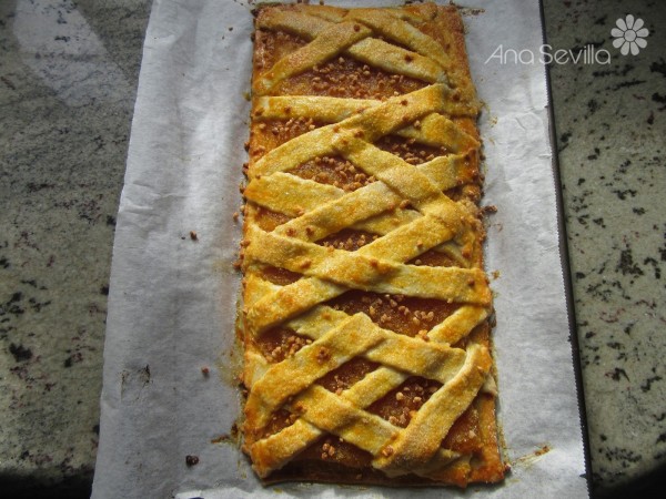 4- Rellenar, espolvorear un poco de granillo de almendra, pincelar los bordes con yema, cubrir con tiras desiguales cruzadas, pincelar, espolvorear azúcar mezclado con un poco de canela.
