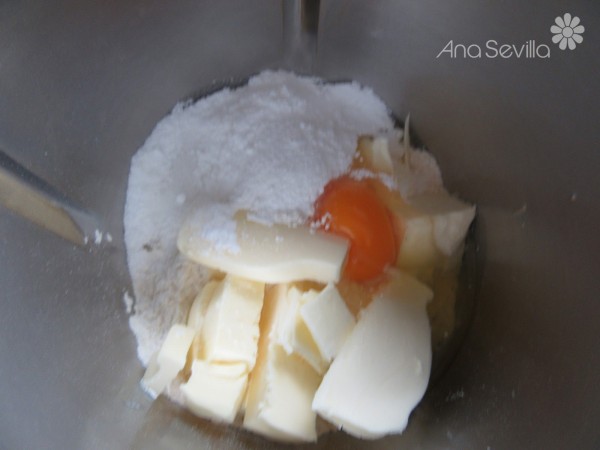 1- Mezclar la harina, mantequilla, huevo entero, sal y azúcar glas en un bol, dando pellizcos a la masa, hasta que esté todo bien integrado.