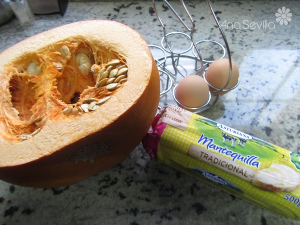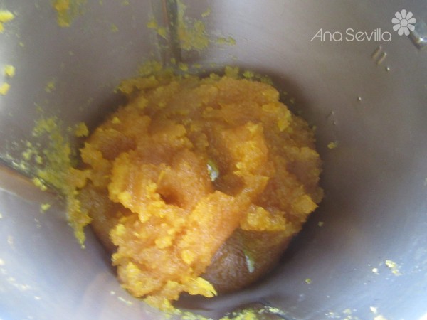 1- Quitar la piel y pepitas y trocear la calabaza en trozos y rallarla.
