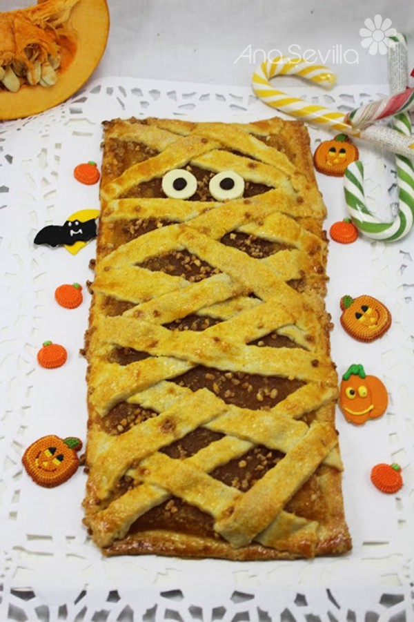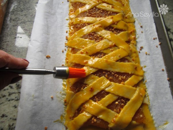 4- Rellenar, espolvorear un poco de granillo de almendra, pincelar los bordes con yema, cubrir con tiras desiguales cruzadas, pincelar, espolvorear azúcar mezclado con un poco de canela.