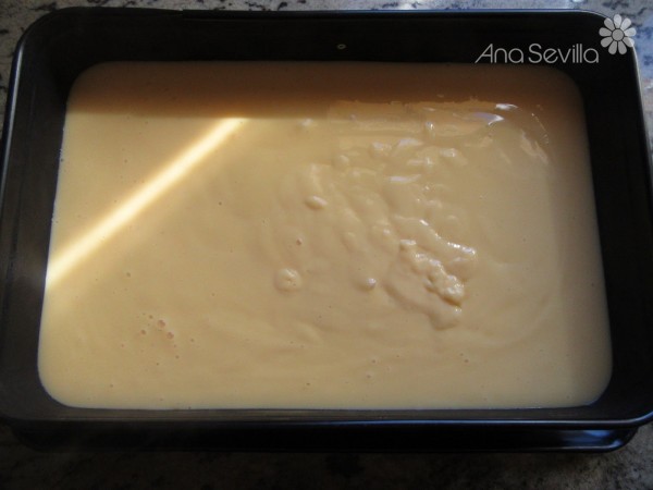 Enfriar y cortar en 2 planchas iguales al molde donde montaremos la tarta. Molde de unos 28x18 cm. (Si es desmontable, que tenga reborde, para que quede ahí el caramelo que sobresalga).