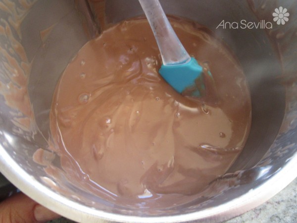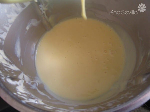 1- Hacer el flan de vainilla: En un hervidor, 600 gr. leche, 1 sobre flan, 2 huevos, 100 gr. azúcar y una cta. vainilla, triturar bien con el turmix, hasta que no tenga grumos. Llevar a fuego bajo y sin parar de remover con varillas hasta que espese. No debe de hervir.