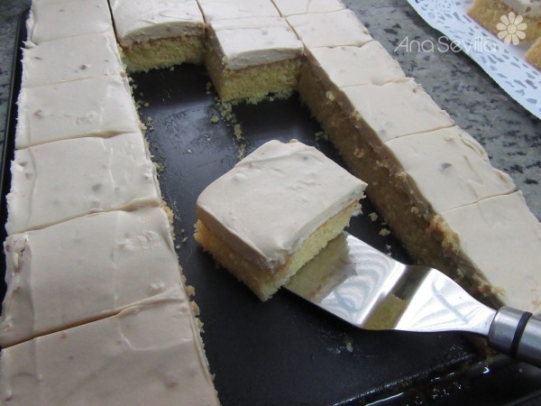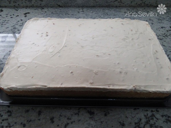 5- Extender sobre el bizcocho frío y almibarado. Llevar unas horas a la nevera, cortar en porciones y adornar a gustos.