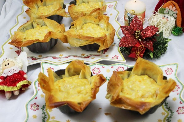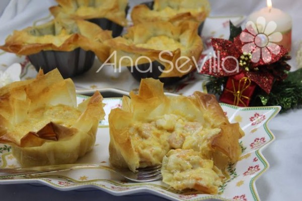 5- Pincelar cada lámina de pasta filo con mantequilla fundida, cortar por la mitad, superponer y doblar que quede la mantequilla en contacto con el molde. (Han de quedar 4 capas de cada lámina). Introducir en moldecitos o flaneras individuales engrasadas. Rellenar, espolvorear un poco de queso parmesano rallado.