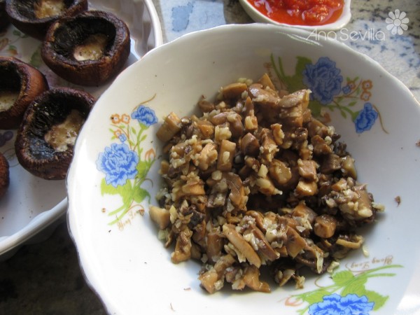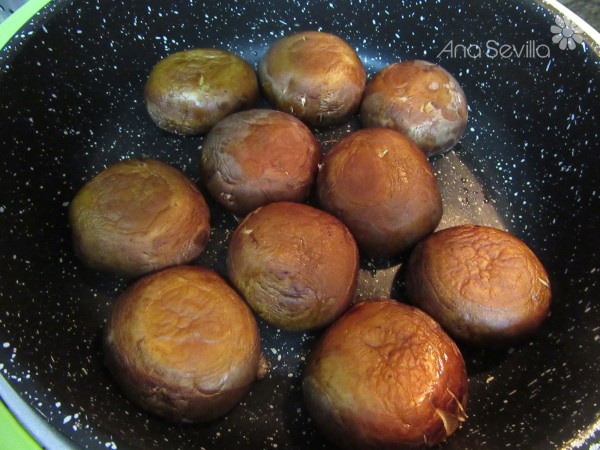 1- Quitar el pie de los champiñones, reservar y hacer los sombreritos a la plancha con un chorrito de aceite, unos 5 minutos por cada lado. Colocar en una bandeja de horno y salpimentar.