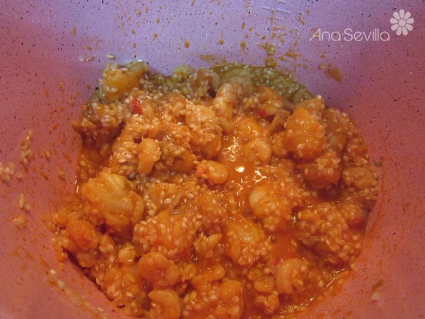 3-Sofreír un poco el rape salpimentado y gambas, a continuación sofreír 1 minuto el arroz.