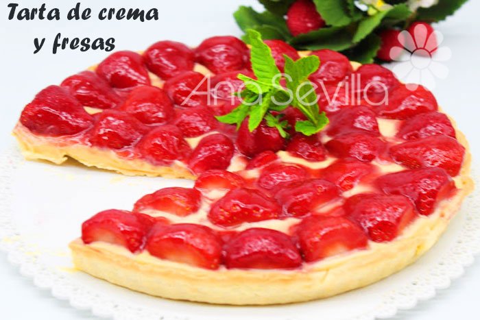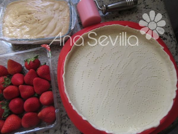 3- Extender la crema sobre la masa quebrada. Cubrir con las fresas por encima cortadas por la mitad. Calentar la mermelada y pincelar sobre las fresas.